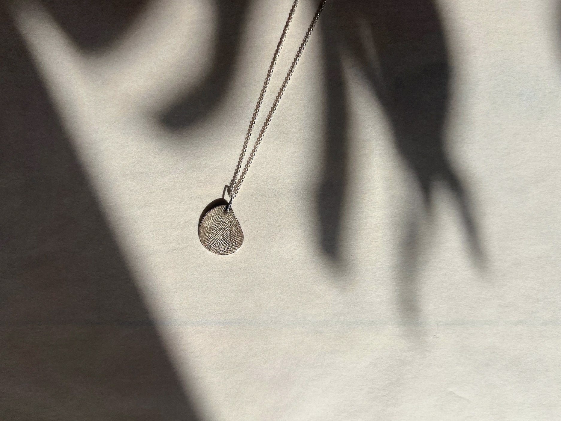 Lost-wax-casted pendant on silver chain, with ginkgo leaf pattern.