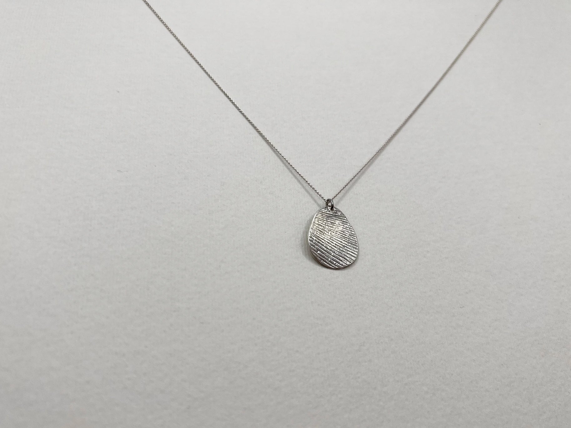 Lost-wax-casted pendant on silver chain, with gingko leaf pattern.